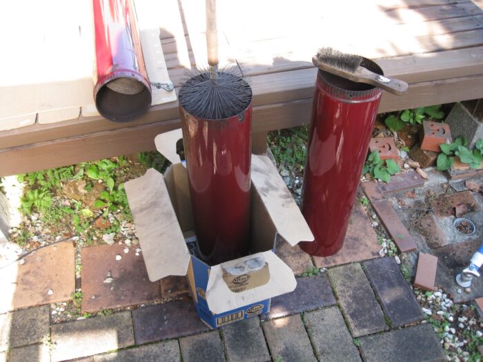 屋根から降りたら、3本の赤いシングル煙突を外に持ち出して、一本ずつブラシを通す。ハンディのワイヤーブラシも使って念入りに。我が家の煙突掃除で出る煤の半分は、この3本の赤いシングル煙突から出る。シングル煙突はいかに煙を冷却してるかがわかるね。
